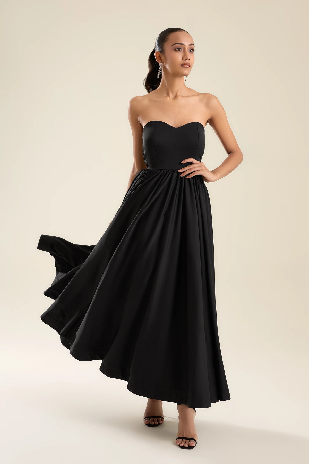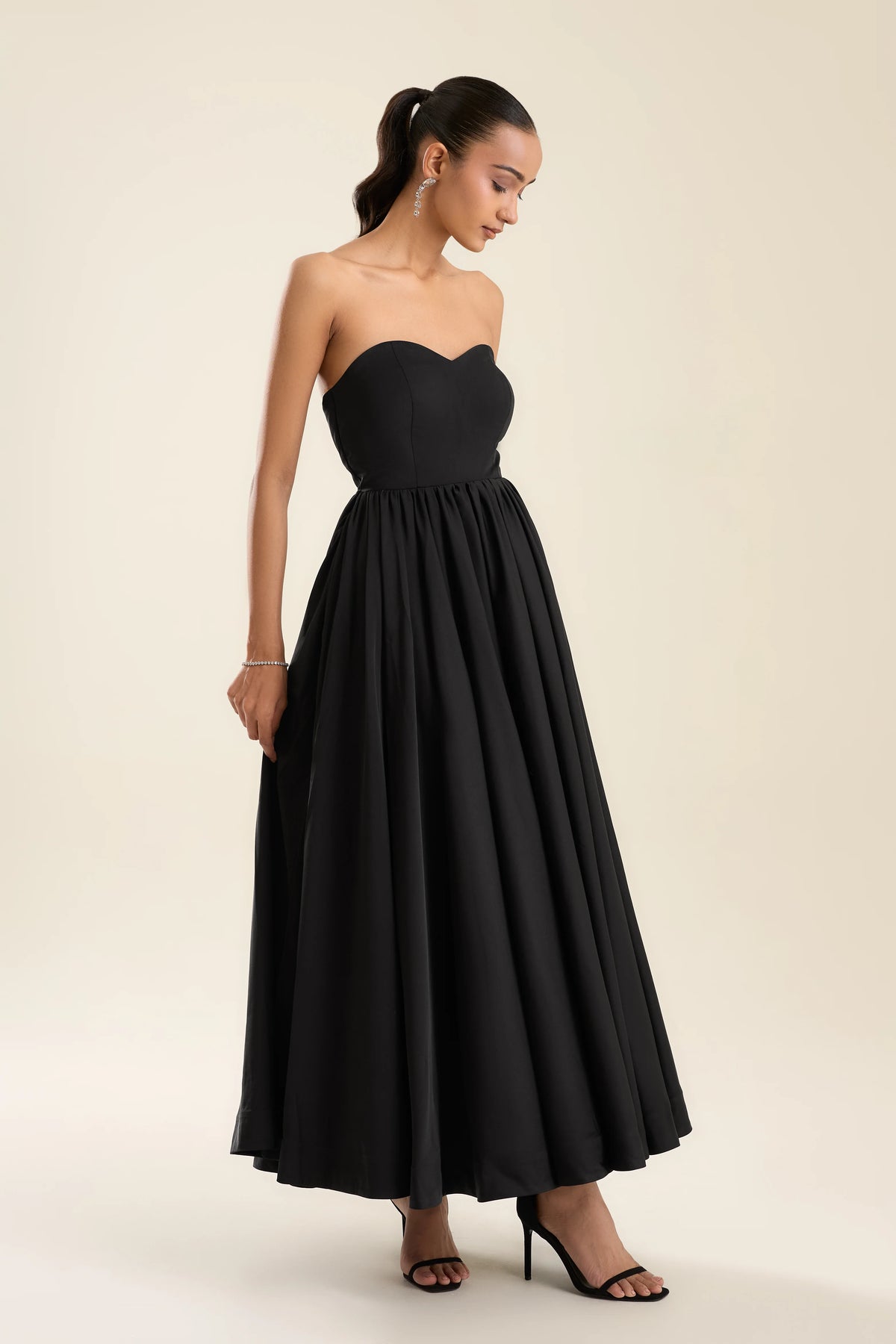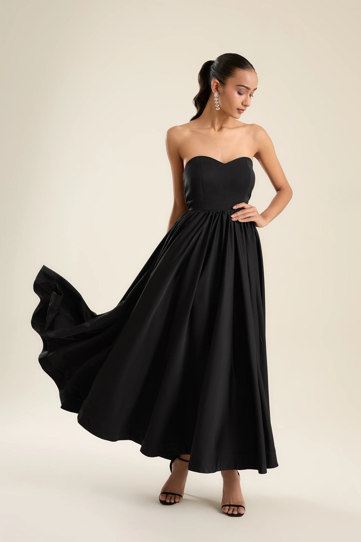 Elevate your evening wardrobe with Diana, an off-shoulder gown crafted in lustrous black satin. Featuring a sculpted sweetheart neckline, the fitted bodice flows into a graceful ankle-length silhouette, exuding old-world glamour.