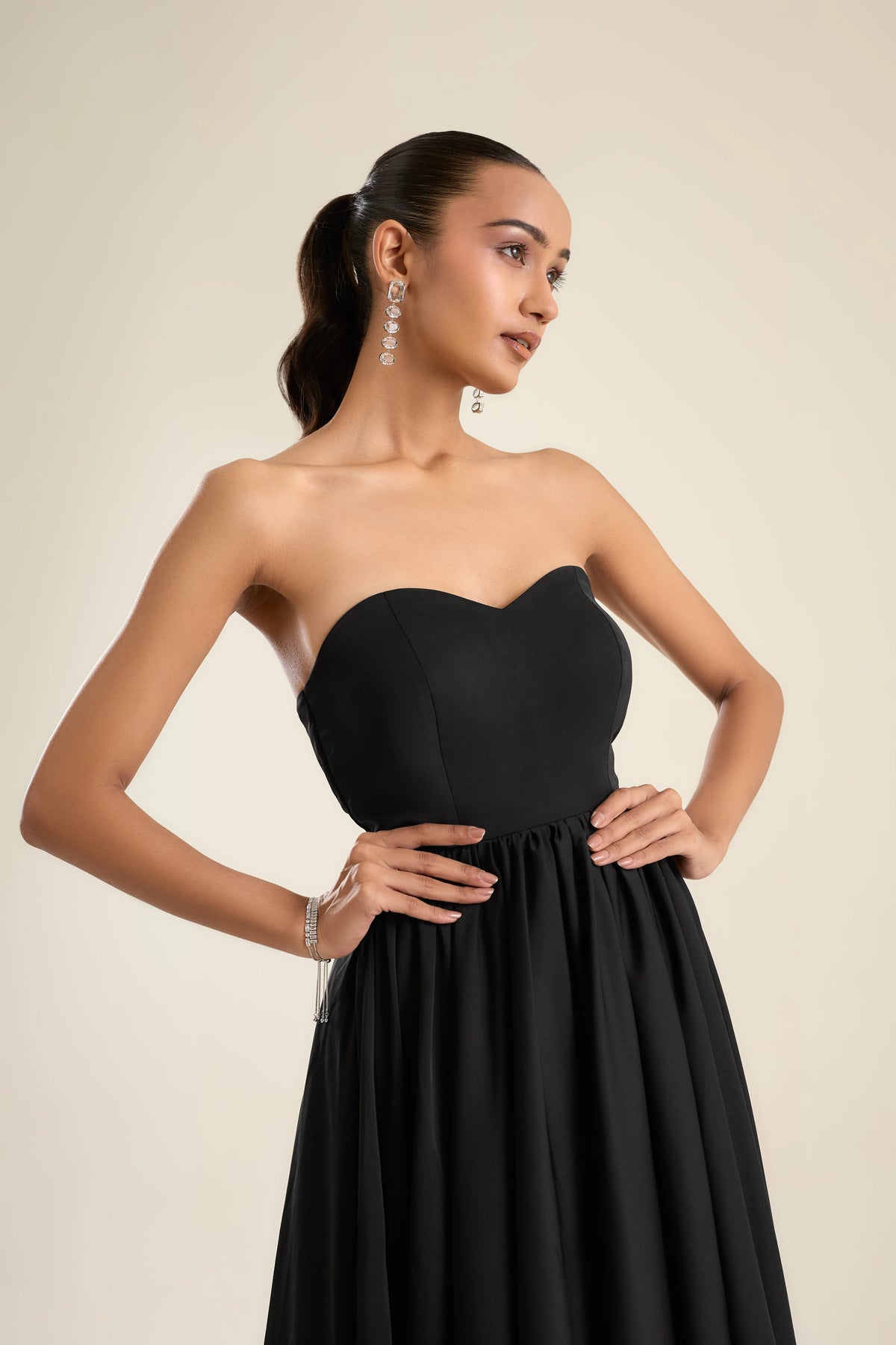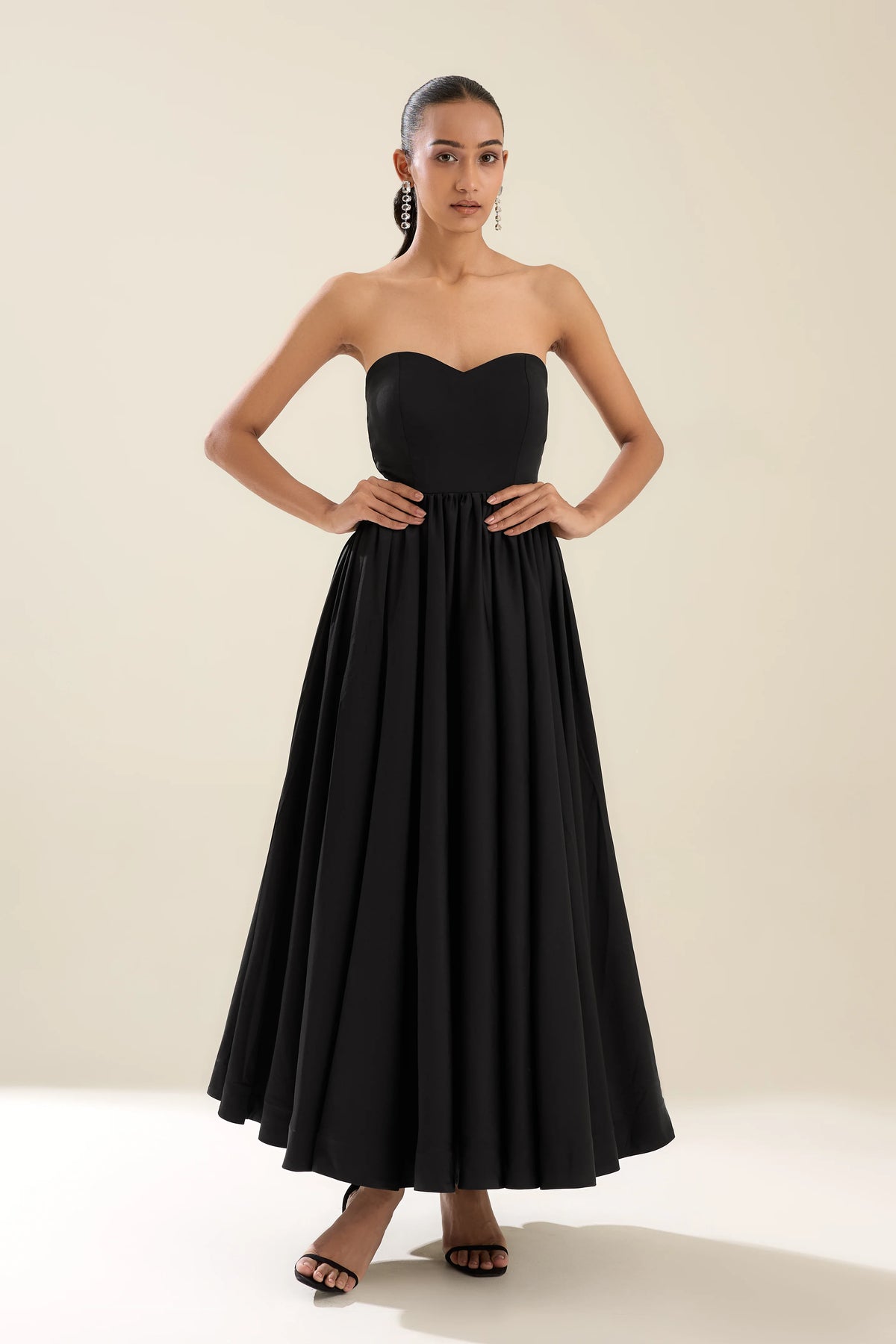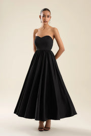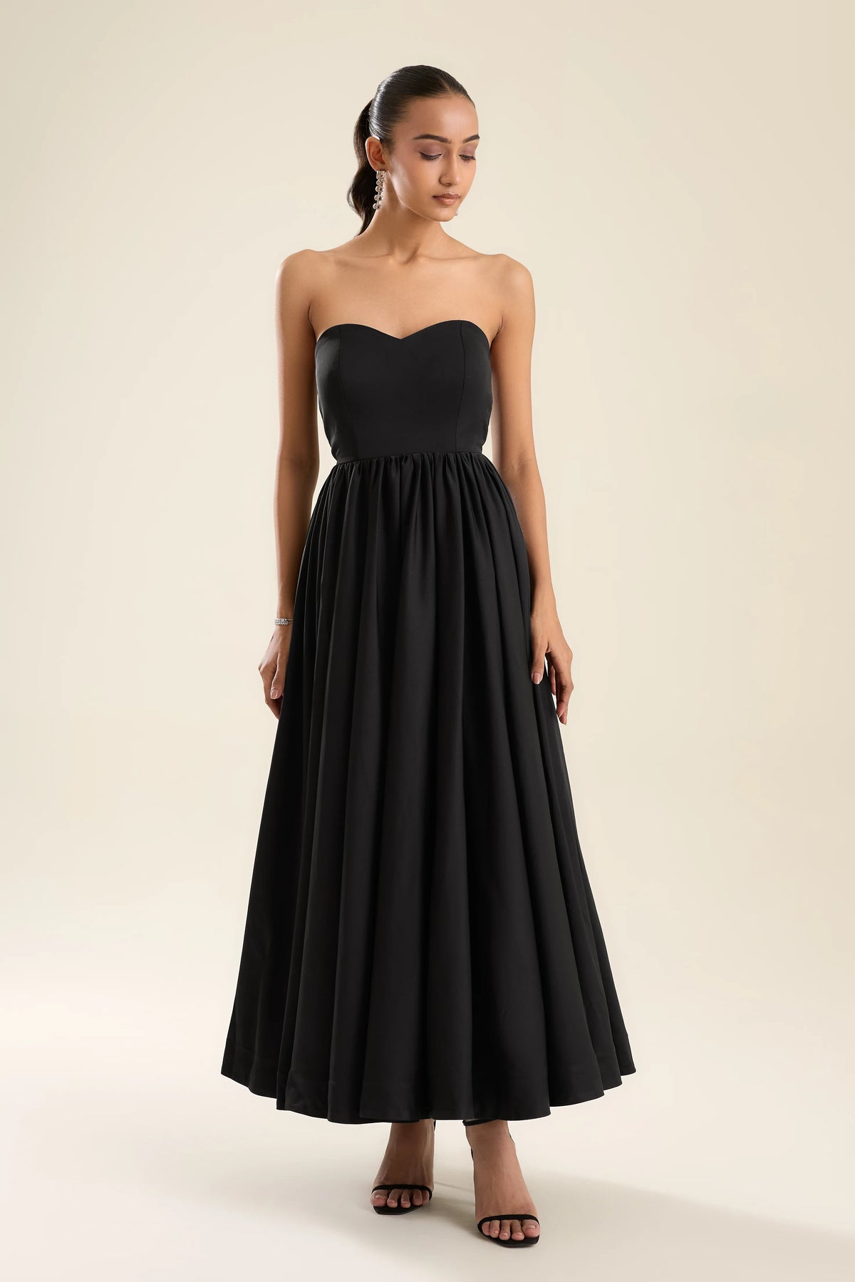 Elevate your evening wardrobe with Diana, an off-shoulder gown crafted in lustrous black satin. Featuring a sculpted sweetheart neckline, the fitted bodice flows into a graceful ankle-length silhouette, exuding old-world glamour.